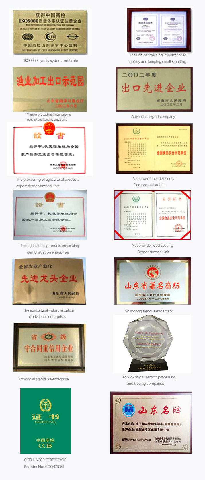 Our company passed the ISO9000 and HACCP in 1998, 1999. In the course of practical production management, combine ISO9000 with HACCP, realize the management of two certificates from product to service. On the basis of guarantee security and sanitation, we have been frequently improving our own level of the management. Through the quality consciousness training to the workers, which make them participate in the quality management amd form a set of quality management system.